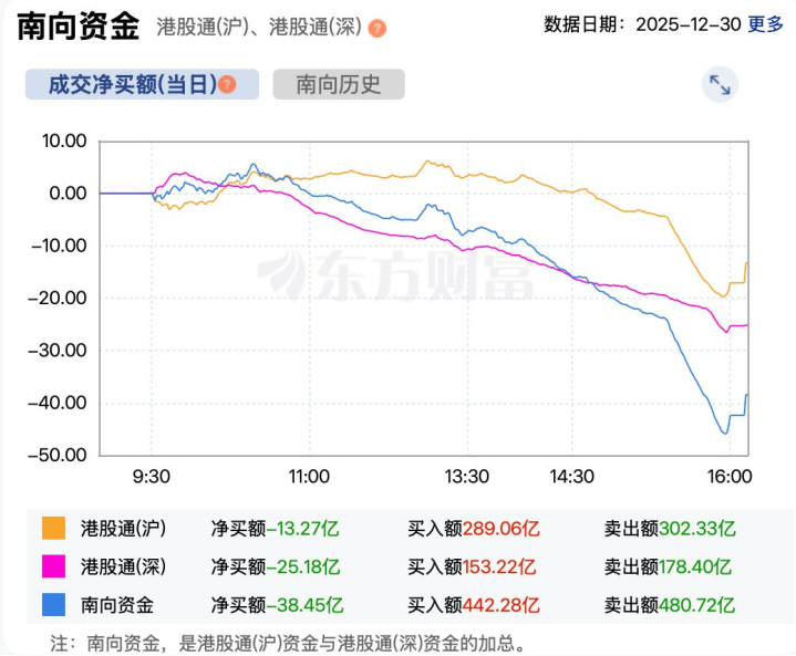 资金方面,年末将至,南向资金继续净卖出。截至收盘,今日南向资金净卖出港股超38亿港元。