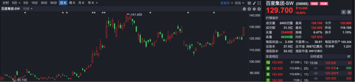 焦点公司方面,百度集团-SW(HK09888)高开高走,最终大涨8.90%。